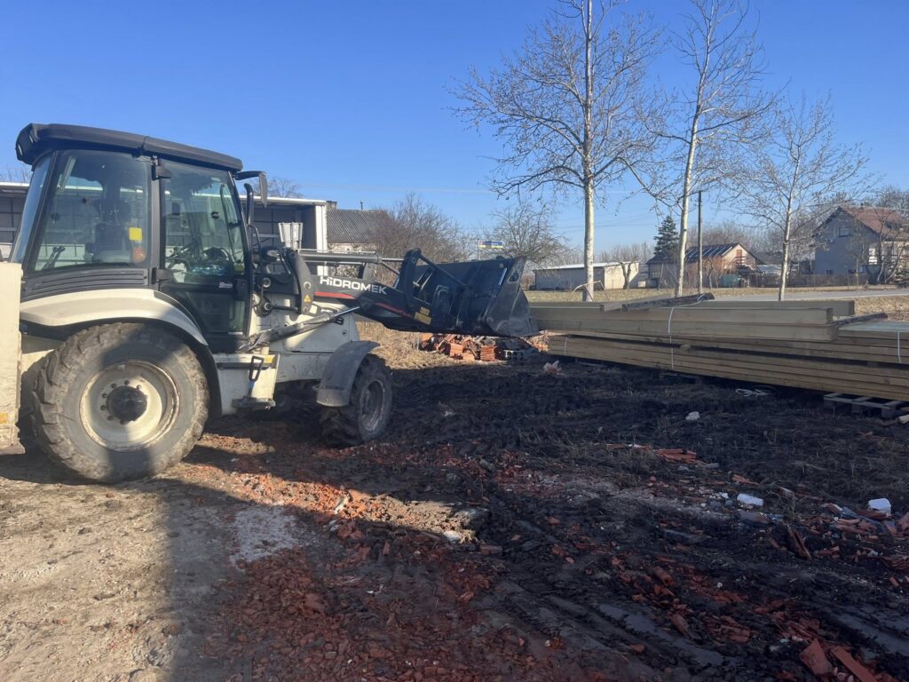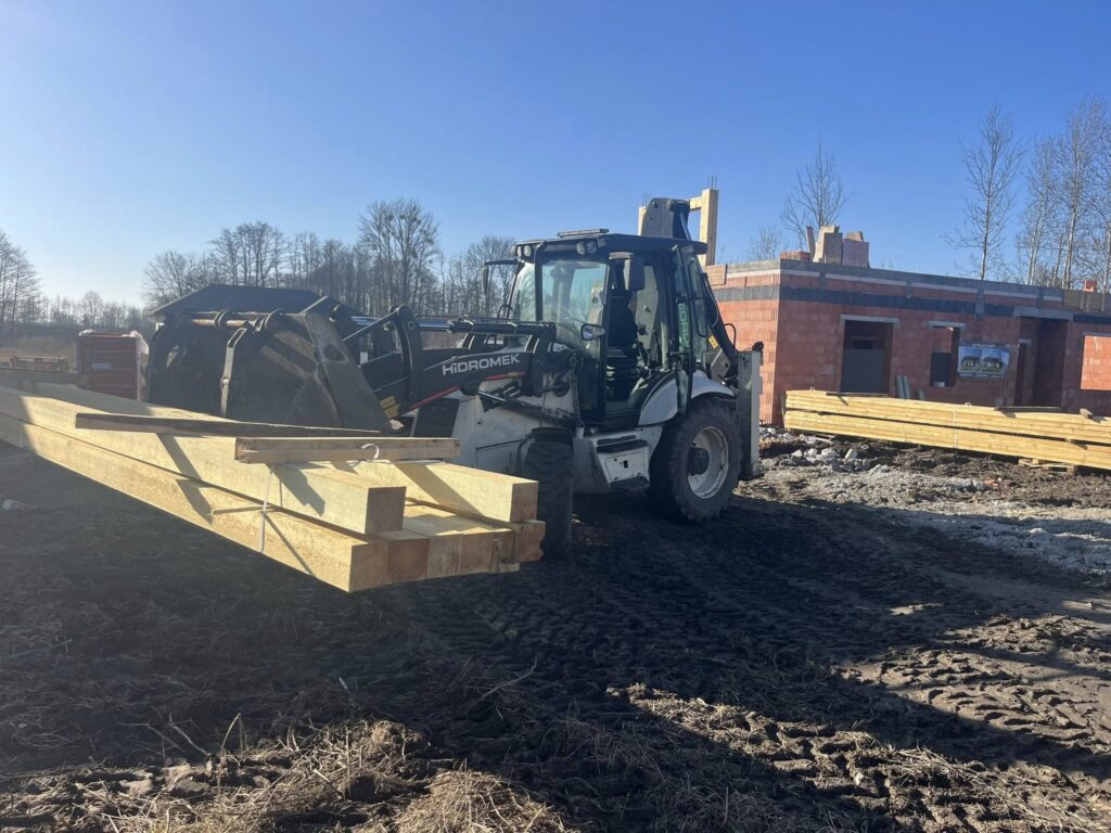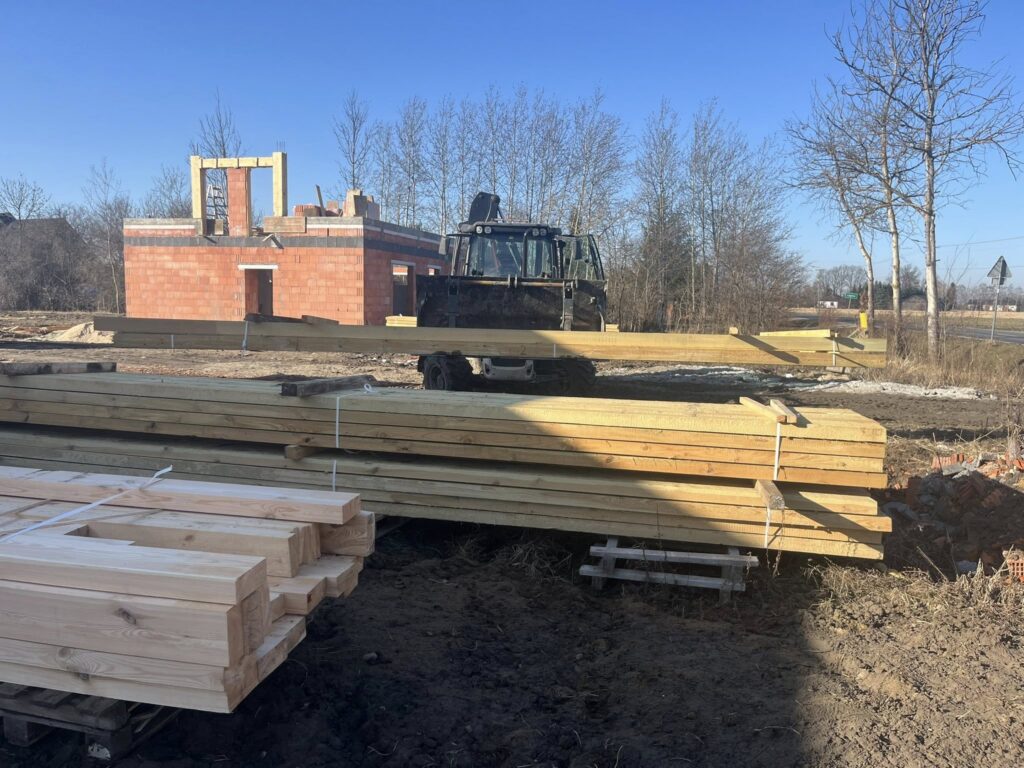 .Kolejny etap prac za nami! Na budowę dotarła więźba dachowa przygotowana pod dwa budynki. Precyzyjny rozładunek to bardzo ważny moment – elementy konstrukcyjne muszą zostać ułożone w odpowiedniej kolejności i w bezpieczny sposób, aby późniejszy montaż przebiegał sprawnie.